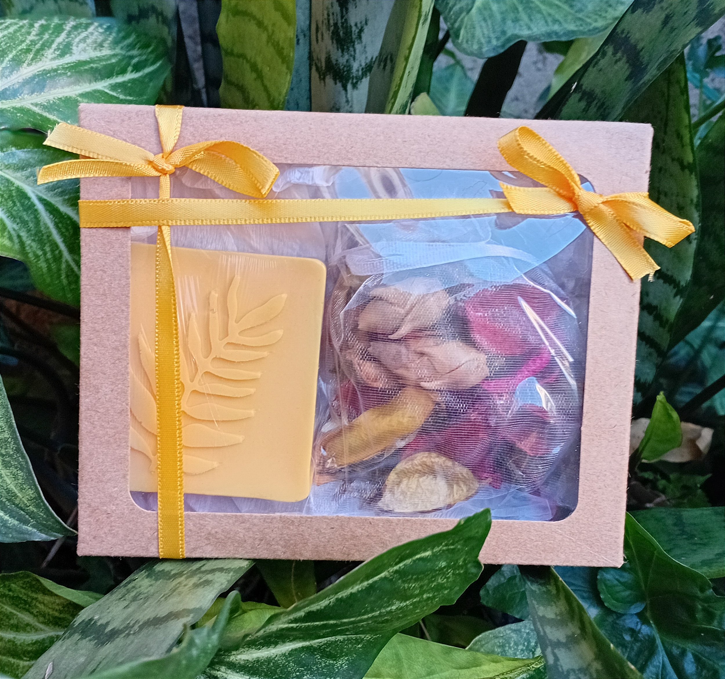 Caixa Natureza. Kit contendo 1 sabonete Glicerinado 90g e 1 sachê com folhas e flores aromatizadas.