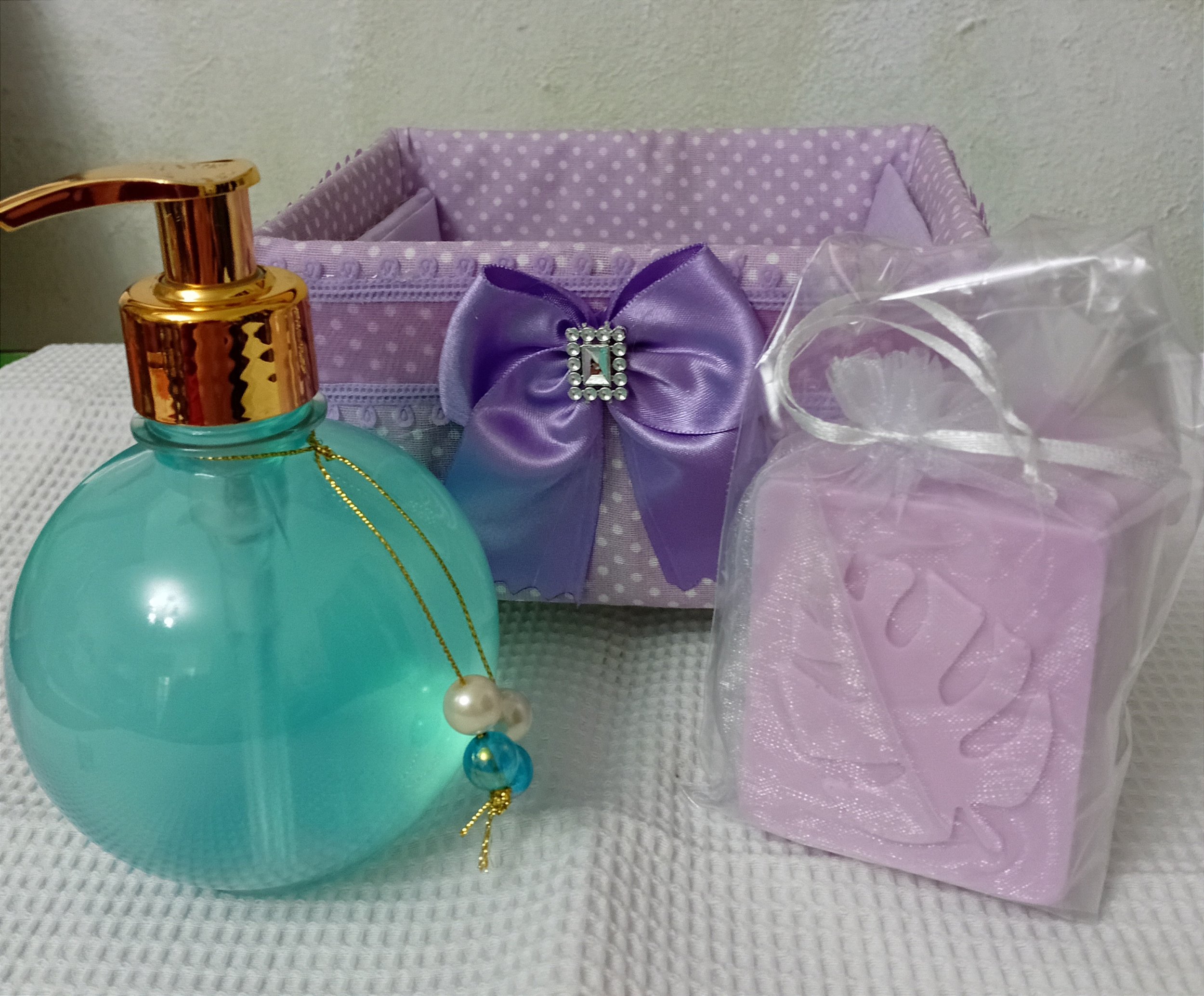 DESCRIÇÃO: Kit em caixa forrada para lavabo. Acondiciona Sabonete Líquido 350ml. Versão luxo. Com válvula dourada e enfeite em miçangas. e Sabonete Glicerinado 90g.